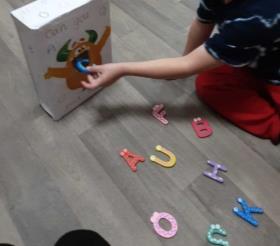 Our Phonics focus has been…Identifying and recognising our own names, having a go at forming recognisable letters and giving meaning to the marks we make, identifying the sounds of letters and feeding them to our letter monster!