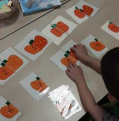 Our Mathematical focus has been… Creating pictures and models using our 2d shapes as well as matching and recognising numbered pumpkins with their corresponding number of pumpkin seeds.