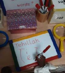 Forming letters and patterns using our fingers in coloured trays of rice, practicing segmenting, and blending a range of CVC words such as c-a-t and h-a-t.