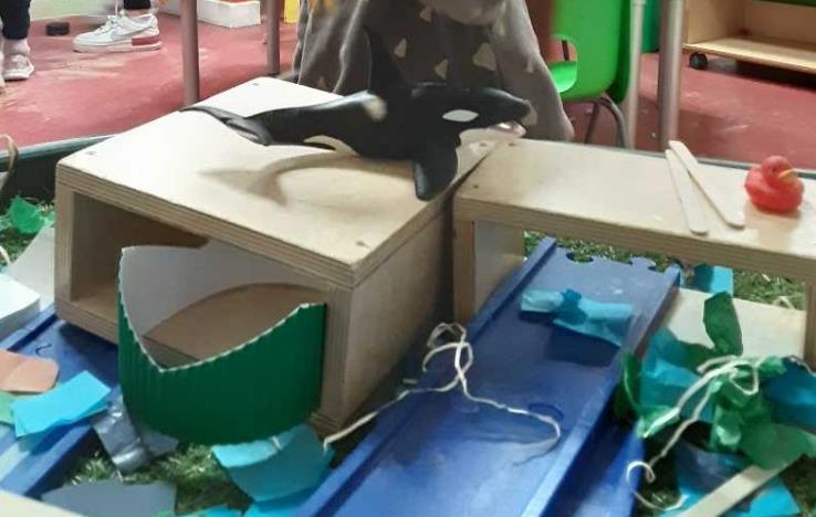 Taking part in a shape hunt within the nursery environment, sharing the story of Snail and The Whale to explore words that sounds the same and exploring the story of The Three Little Pigs through our senses in a story sensory tray.