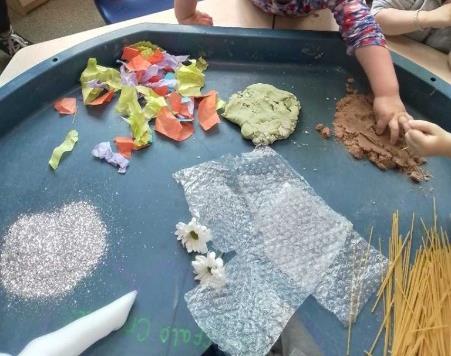 On the farm creating multiple tuff trays exploring muddy tissue paper and creating on the farm animal footprints as well as exploring their spaghetti messy play tray. The Babies have also been enjoying their Tiny Mites music sessions sharing a range of nursery rhymes. Finally, the babies have also been building towers using large sensory blocks.