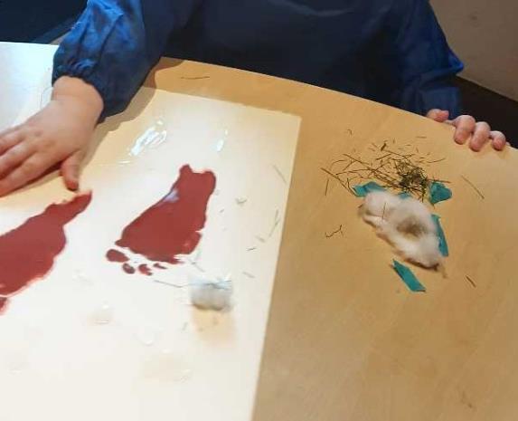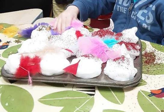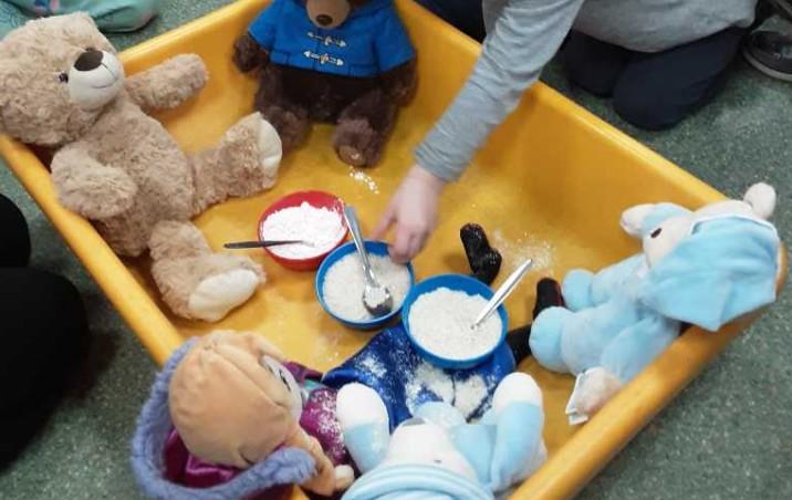 Taking part in a ‘Goldilocks and the 3 bears’ roleplay game in celebration of World Book Day. They have been using ‘crazy foam’ to make and decorate pretend cupcakes. They have also been developing their hand eye coordination when using tweezers to pick up small sensory objects.